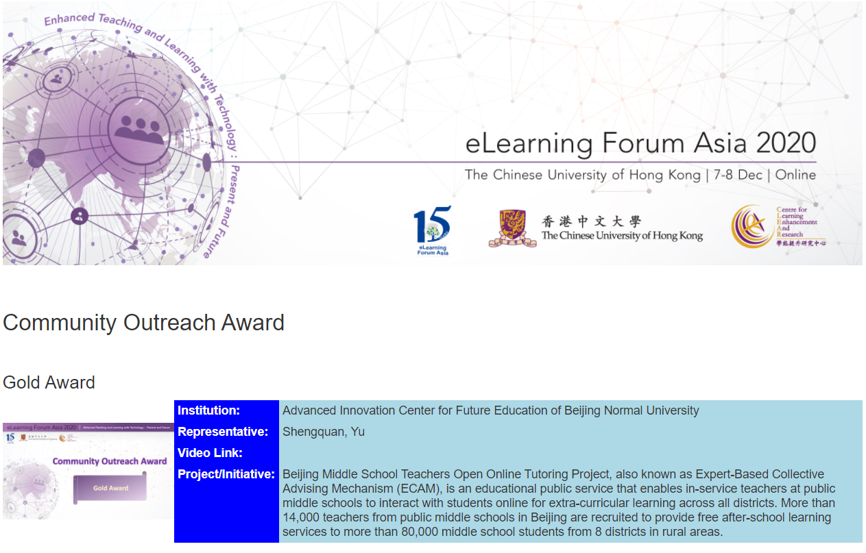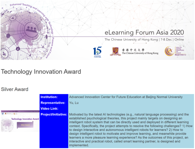 on december 8th, 2020, the organizing committee of the 15th elearning forum asia (elfa) announced that advanced innovation center for future education (aicfe) received the gold award for community outreach (figure 1) and the silver award for technology innovation (figure 2), which were given respectively to expert-based collective advising mechanism (ecam) and intelligent robot project.