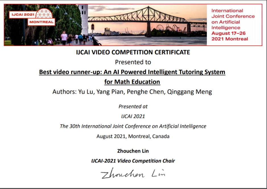 the video of “ai powered intelligent tutoring system for math education” made by ai lab of aicfe won the best video runner-up in video competition at the 30th international joint conferences on artificial intelligence (ijcai). the video uses a vivid and straightforward form to show everyone how knowledge graph, learner modeling, knowledge tracing, auto-grading, and other technologies are applied to the intelligent tutoring system to provide learners with an automatic and personalized learning experience while reducing teachers’ workload.