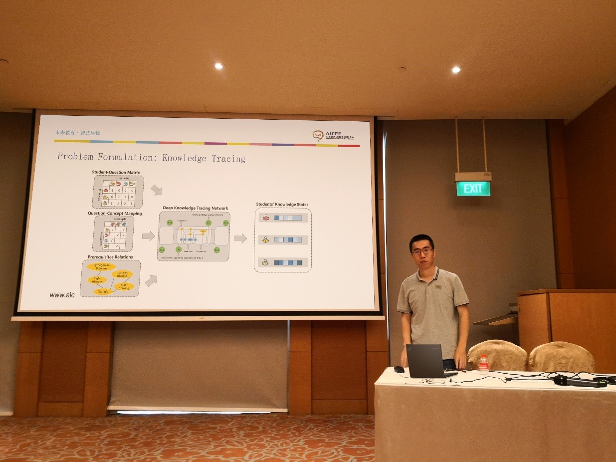 in the oral presentation session, dr. penghe chen presented more details about this work, including what problems knowledge tracing tries to solve, issues of current models, how prerequisite relations were utilized to improve existing models, and experimental results compared with baselines.