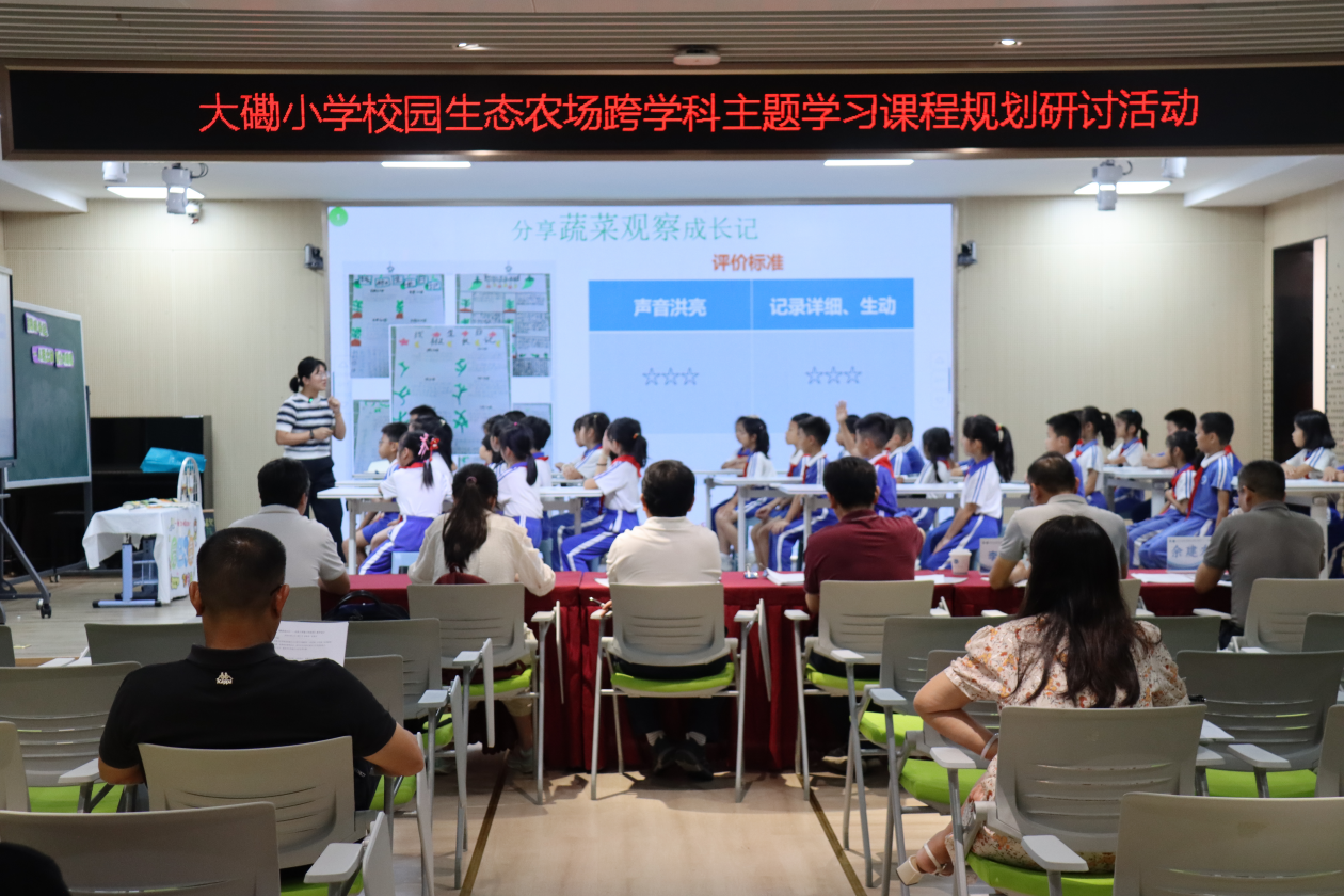 6月12日下午,北师大项目组在大磡小学开展“校园农场跨学科主题学习课程规划研讨活动”。与会人员首先参观4500平方米校园生态农场。随后观摩温慧君老师执教的二年级《蔬菜成长记——从泥土到爱心的旅程》跨学科课例,学生通过分享生长日记、朗诵、表演情景剧等形式,完整呈现从种植到爱心义卖的实践过程。接着袁树娟老师作校园生态农场课程规划进度汇报,介绍以“自然・人文・科技”三位一体的课程体系构建思路。最后,余胜泉教授从课程体系构建方法、跨学科整合策略、数字化实施路径、教学评一体化体系等方面进行了详细专业的点评。他充分肯定了课程的完整性,建议以大单元设计驱动任务,借助教学平台沉淀学习过程,完善教学评一体化体系,拓展传统文化与科技融合的内容,并鼓励学校将农场课程打造成特色名片,推动跨学科教育的深度发展。本次活动通过课例展示、课程汇报与专家指导,清晰呈现了跨学科学习实践成果,为构建特色课程体系、培养学生综合素养指明了方向。