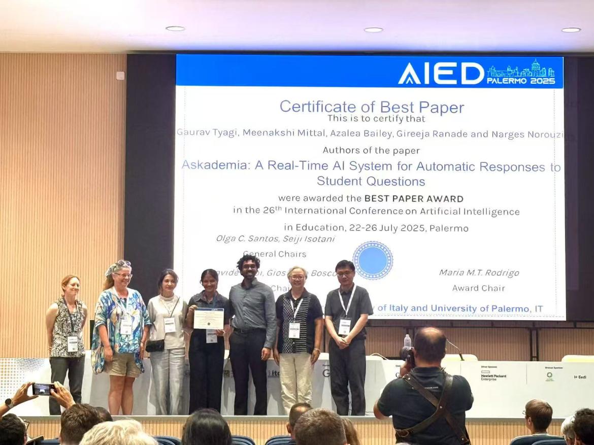 自上世纪创办以来,aied会议始终代表着教育人工智能领域的前沿研究进展。随着生成式人工智能等技术的快速演进,会议研究议题也逐年拓展。2025年会议创新性设置了七个不同论文轨道(paper track),呼应当前教育人工智能领域的不同重要方向与全球教育数字化转型中的关键挑战。来自美国加州大学伯克利分校的研究团队的论文“askademia: a real-time ai system for automatic responses to student questions”,获得本届会议“最佳论文”奖。