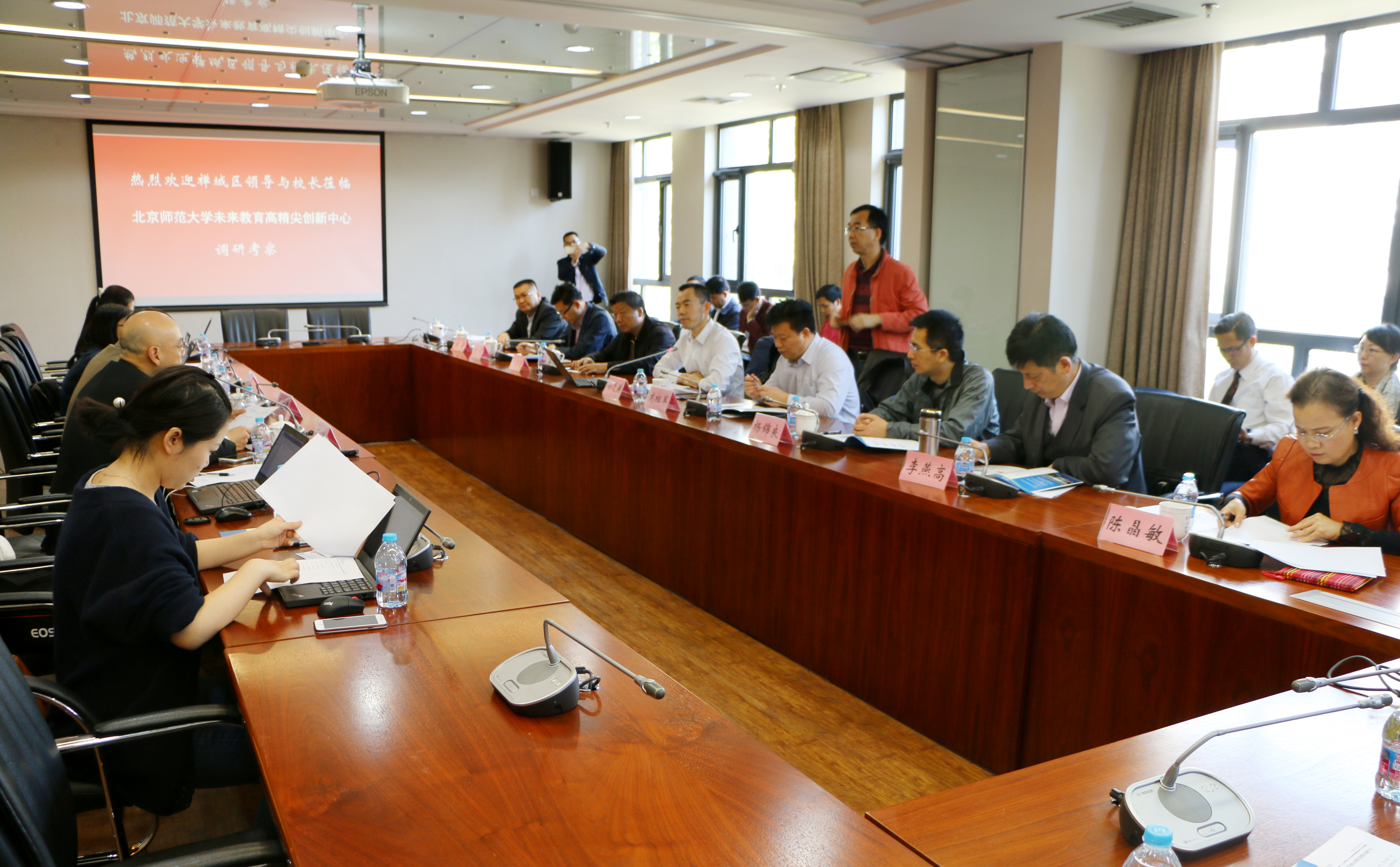 2017年4月24日上午广东省佛山市禅城区教育代表团20余人在教育局局长孙近国的带领下来北京师范大学未来教育高精尖创新中心进行考察,代表团成员有禅城区教育局的教育管理者和初高中校长。中心出席交流会的有中心执行主任余胜泉教授,融合应用实验室陈玲主任,国际合作办公室汤伟总监,学科教育实验室李晓庆常务副主任等。