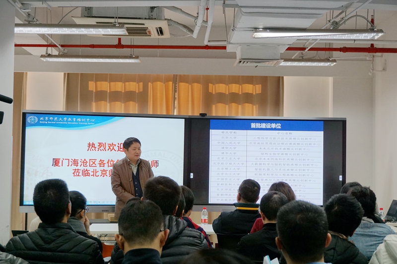 为深入贯彻落实党的十九大精神,积极落实《教育信息化2.0行动计划》,推动信息技术与教育教学深度融合,促进优质教育资源共建共享,深入推进stem教育在海沧区学校落地生根,全面提升学校的教育品质,2018年11月16日、17日,厦门海沧区中小学教师代表团访问中心并展开了为期两天关于未来教育主题的交流培训活动。此次访问团成员以北京师范大学厦门海沧附属学校教师为主,由海沧附属学校校长、党委书记蔡稳良带队,一行共有40人。