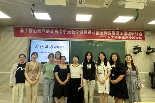 2021年6月17日上午,通州区教师研修中心初一语文研修员郑美丹组织全体初一语文教师到人大附中通州校区,参加了“基于核心素养的文言文单元教学课程设计暨高精尖资源工作坊研讨会”的研修活动,北京师范大学未来教育高精尖创新中心学习科学实验室副主任崔京菁博士,以及来自燕郊的六位语文教师共同参与了此次活动。
